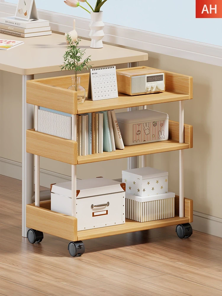 移動可能な実木製ブックシェルフ - 教室やデスクサイドに最適な収納ラック!学生の教科書やノートをすっきり整理できるキャスター付きの便利なアイテムです。美しいデザインでお部屋をおしゃれに演出!