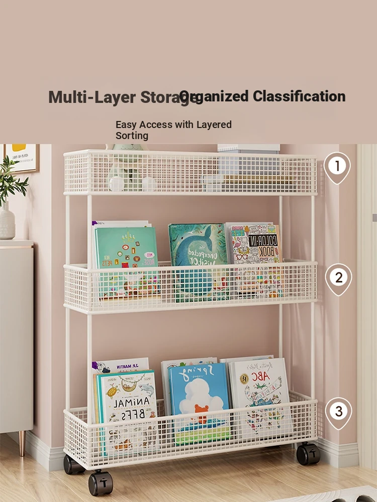 Slim Space-Saving Bookshelf for Kids - Stylish Iron Floor Stand, Perfect for Narrow Doorway Storage, Ideal for Children's Picture Books, Ultra-Thin Wall-Side Cabinet for Maximum Organization.