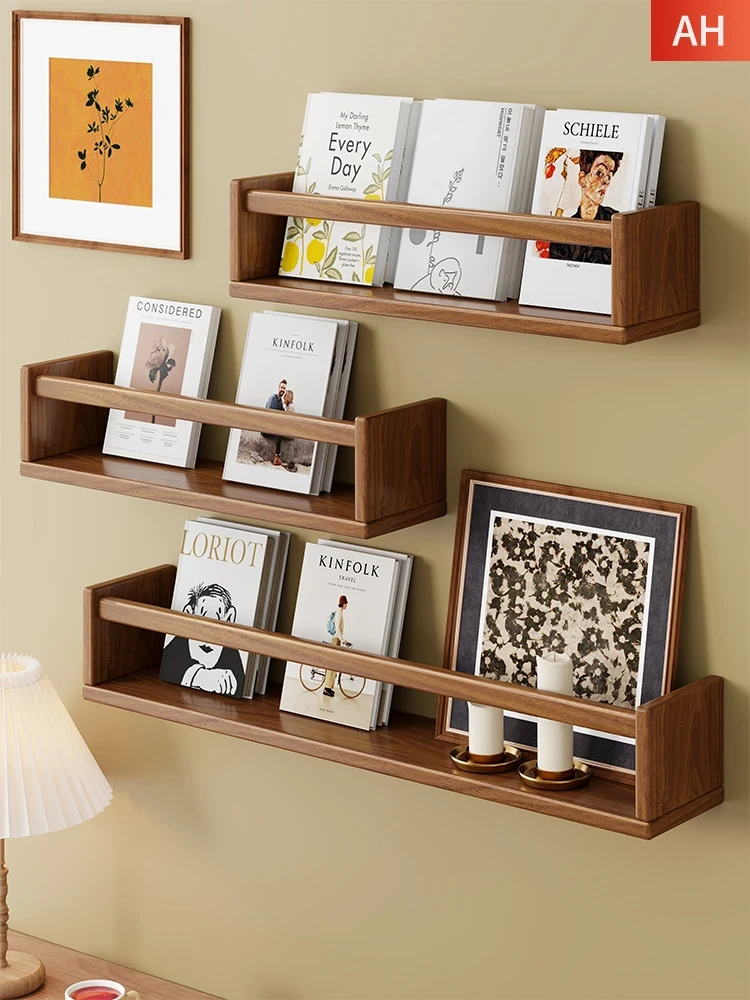 Solid Wood Wall-Mounted Bookshelf for Kids' Bedrooms - Stylish Magazine Rack and Bedside Storage Shelf for Living Room and Kitchen Organization