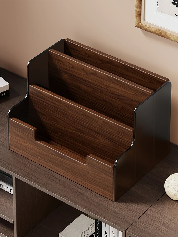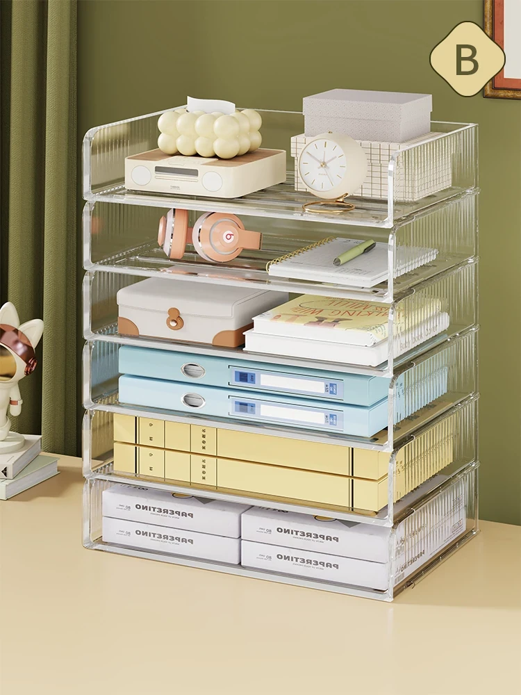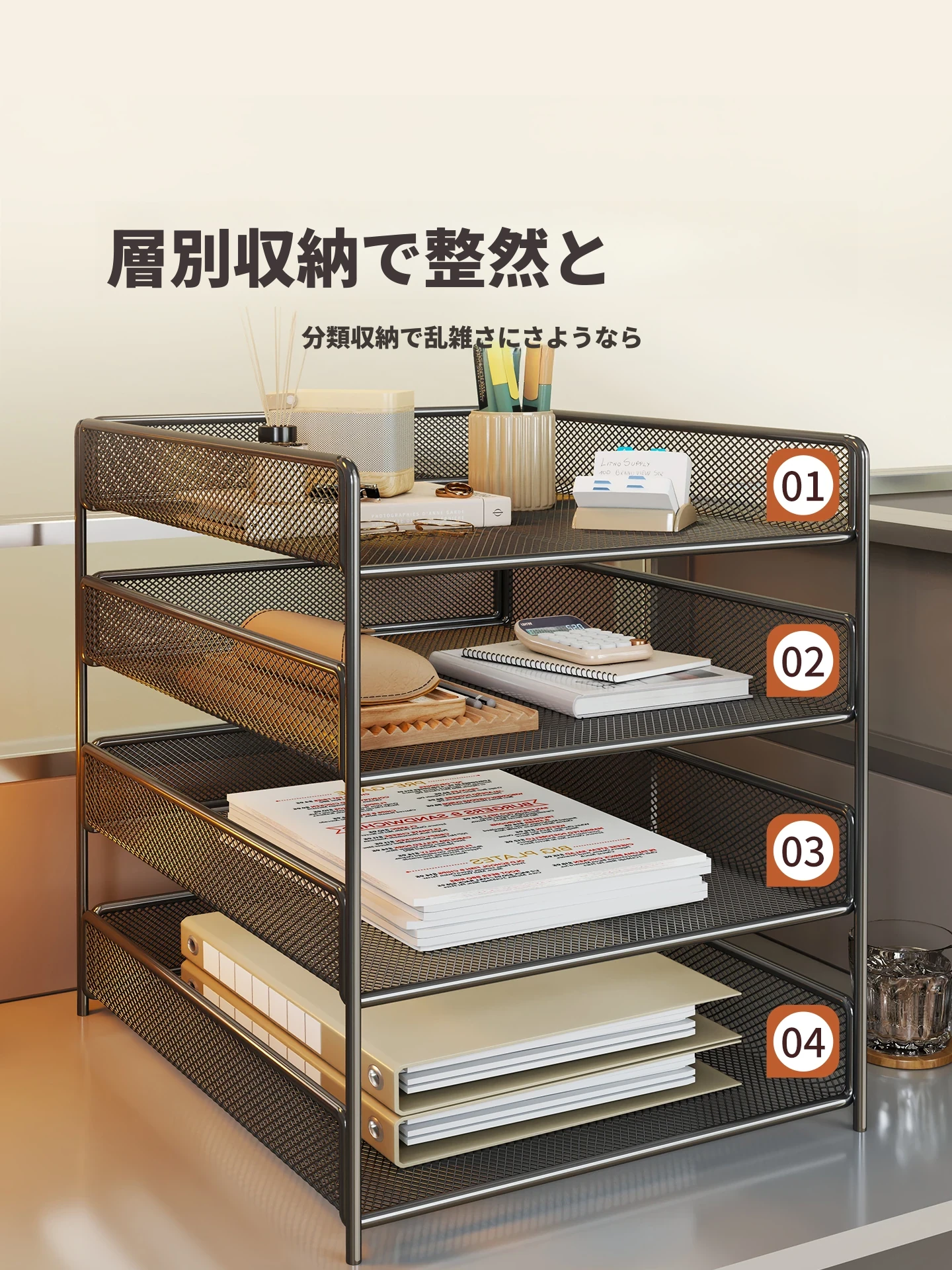 オフィスデスク上の多層ファイル収納ラック|家庭用書斎に最適!書類整理や雑誌収納に便利なスタイリッシュなデザインの書架。すっきりとした空間作りをサポートします!