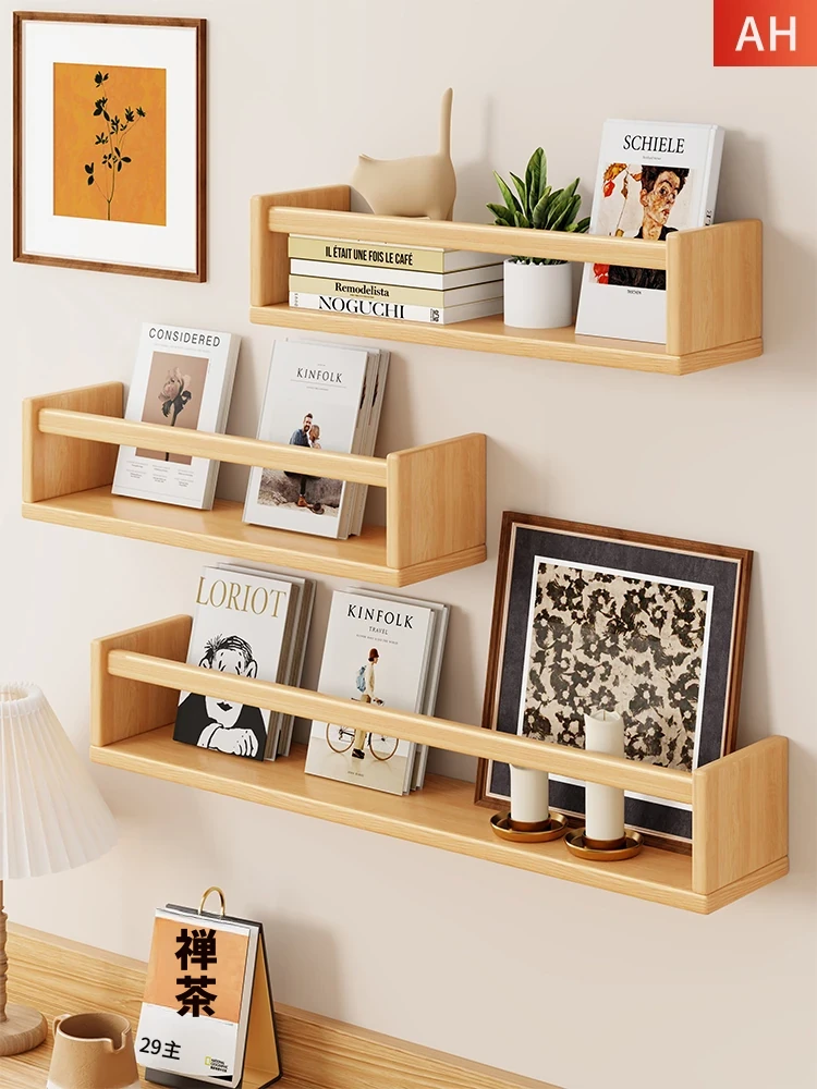 天然木製の壁掛け書棚 - おしゃれな収納とディスプレイに最適!リビングを彩る雑誌ラックとして、書籍や小物を美しく整理・展示。お部屋のインテリアを格上げするアイテムです。